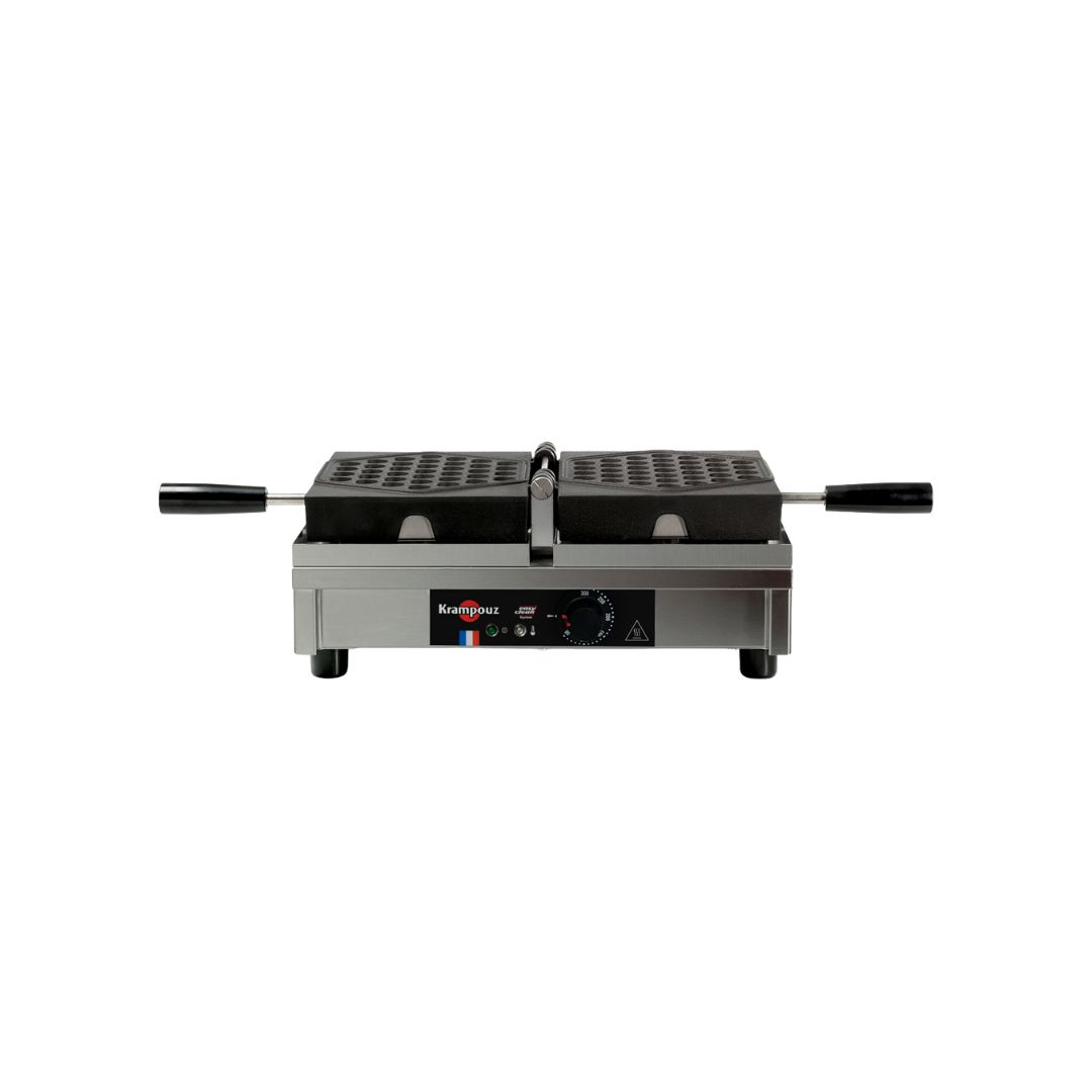 La Krampouz WECAUAOA es una gofrera profesional Bubble con apertura 180° que cocina 1 gofre Bubble (egg waffle) simultáneamente en 2 minutos con distribución perfecta de masa gracias al giro, diseñada para tentempiés dulces y cucuruchos rellenos en creperías con alta rotación. Sus placas de hierro fundido bruto con Pack Résistance aseguran alveolos finos crujientes por fuera y esponjosos por dentro con menos masa. Ideal para cafeterías, heladerías y food trucks que necesitan gofres Bubble auténticos en formato compacto. ¡La gofrera giratoria que hace egg waffles perfectos de un solo movimiento!
