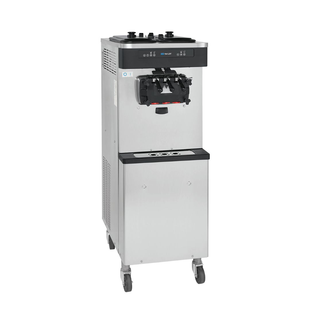 La Taylor C791 es una máquina de helado soft twin twist con dos cilindros de 3,2 litros y dos tolvas de 13,2 litros, alimentados mediante sistema SHR que mantiene la mezcla por debajo de 5 °C en modos automático y de espera. El control Softech regula la refrigeración midiendo la textura del producto, mientras las luces de mezcla baja y mezcla agotada, junto con alarma sonora opcional, avisan al operador cuando es necesario recargar mezcla y protegen el equipo ante falta de producto. La puerta de termoplástico con diseño especial, las palancas de extracción con cierre automático, el sistema de interbloqueo de puerta y las ruedas frontales con freno facilitan el servicio, la seguridad y la limpieza diaria en entornos de trabajo intensivo.