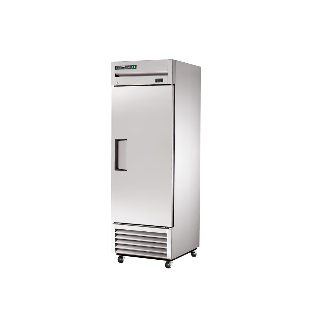 El True T-23-HC ofrece un gabinete vertical de una sección con una puerta sólida de cierre automático y tres parrillas ajustables recubiertas en PVC, optimizado para almacenar productos a 0.5-3.3°C mediante un sistema capilar balanceado de fábrica. Utiliza un compresor de 1/3 HP y ventiladores de condensador y evaporador de última generación que mueven un volumen de aire consistente con baja generación de calor y consumo energético reducido. El aislamiento de poliuretano de alta densidad inyectado en toda la estructura asegura una excelente retención térmica, mientras que la unidad condensadora montada en la parte inferior facilita el mantenimiento y permite operar en áreas libres de grasa.